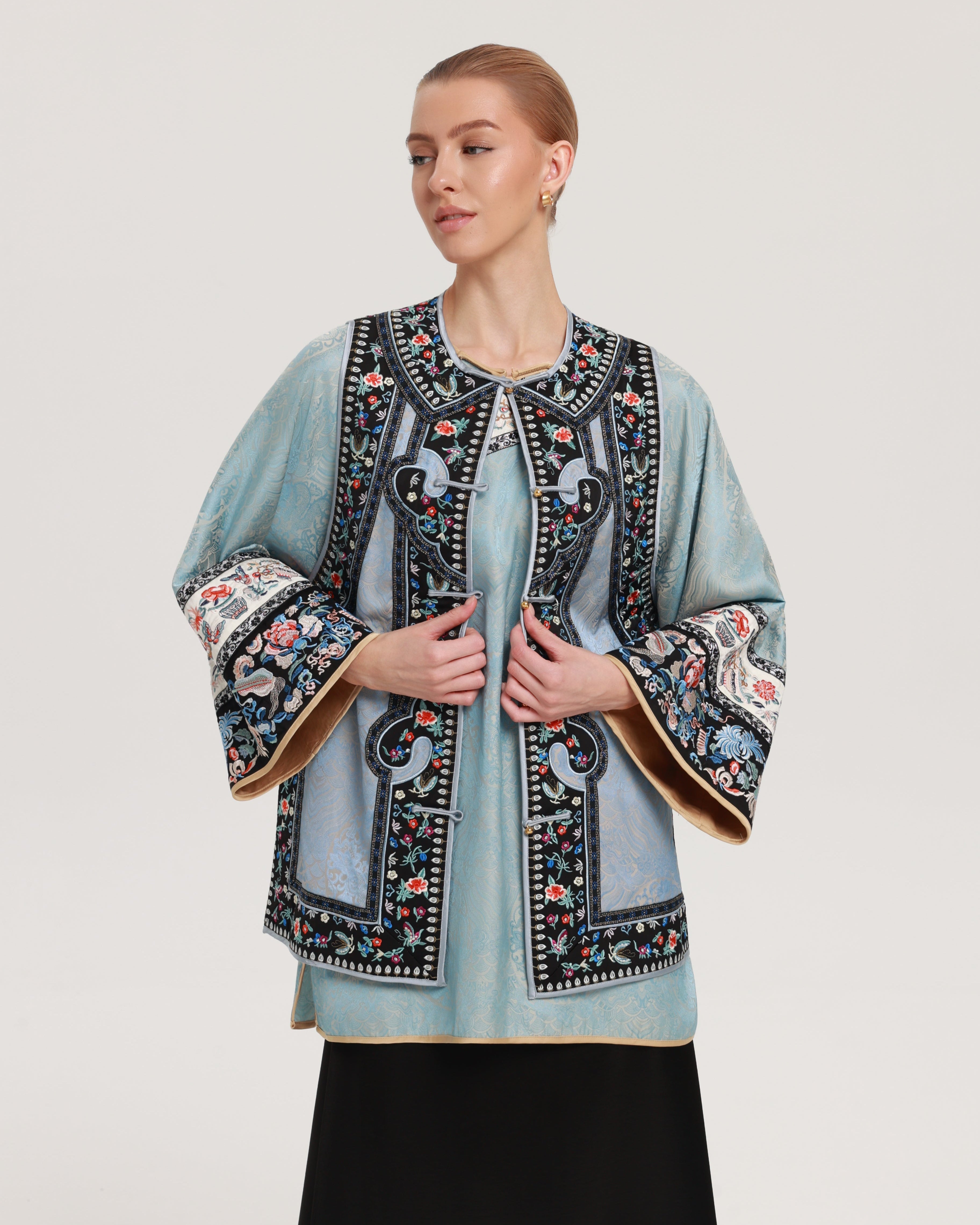 This exquisite ensemble features a heavily embellished non-heritage embroidered waistcoat paired with a coordinating inner top. It masterfully blends traditional ethnic motifs with contemporary New Chinese elegance, creating a truly distinctive cultural statement.