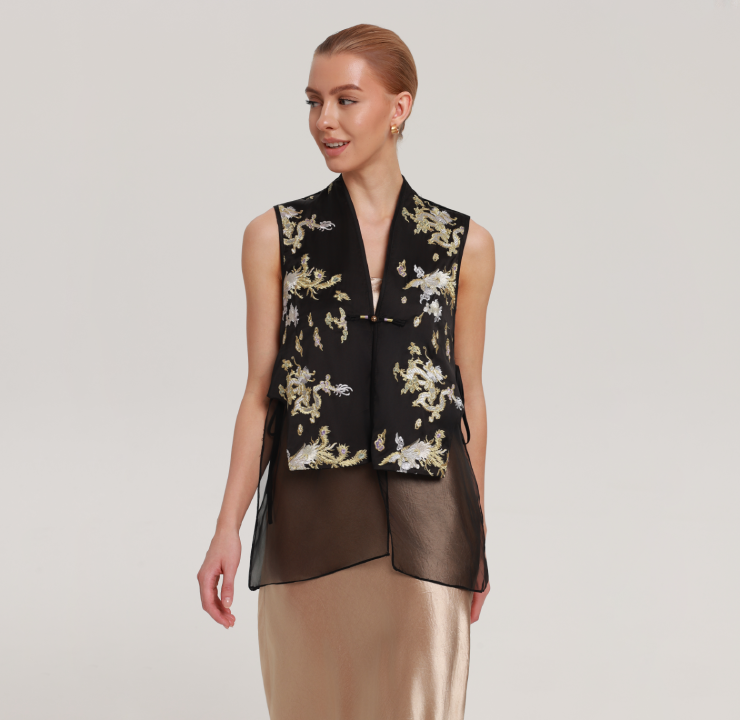 This exquisite ensemble features a heavily embellished non-heritage embroidered waistcoat paired with a coordinating inner top. It masterfully blends traditional ethnic motifs with contemporary New Chinese elegance, creating a truly distinctive cultural statement.